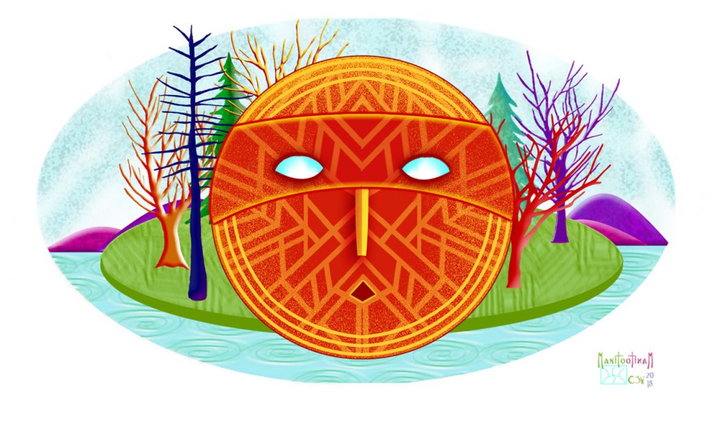 « Les bâtiments du collège étaient d’architecture militaire. Comme paysage, rien pour générer des souvenirs impérissables ou attendrissants. Par contre il y avait une petite île au milieu d’un petit lac. C’est le souvenir heureux que je voulais transmettre à ma façon… la nature avec les montagnes au loin. Puis j’ai imaginé un Manitoo parce que la culture immatérielle du collège reposait sur l’Esprit représenté par l’espoir et la fierté. »